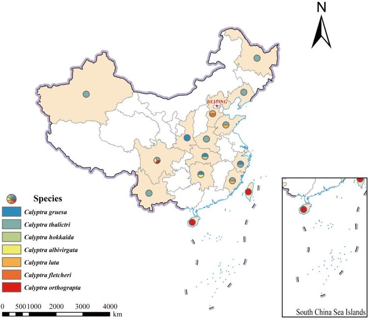 Географическое распространение семи видов Calyptra, зарегистрированных в китайской фауне.