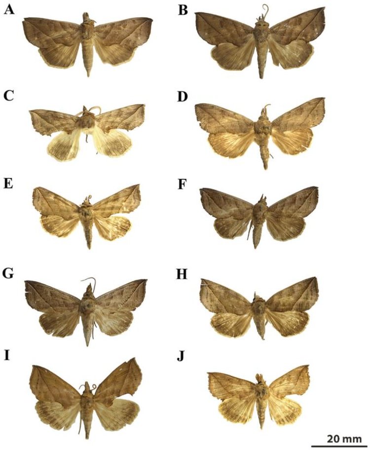 Взрослые особи Calyptra spp: (A) C. gruesa ♀; (B) C. gruesa ♂; (C) C. thalictri ♂; (D) C. albivirgata ♂; (E) C. hokkaida ♂; (F) C. orthograpta ♂; (G) C. orthograpta ♀; (H) C. fletcheri ♀; (I) C. lata ♂; (J) C. lata ♀. Источник: Северо-Западный университет A&F, Китай.