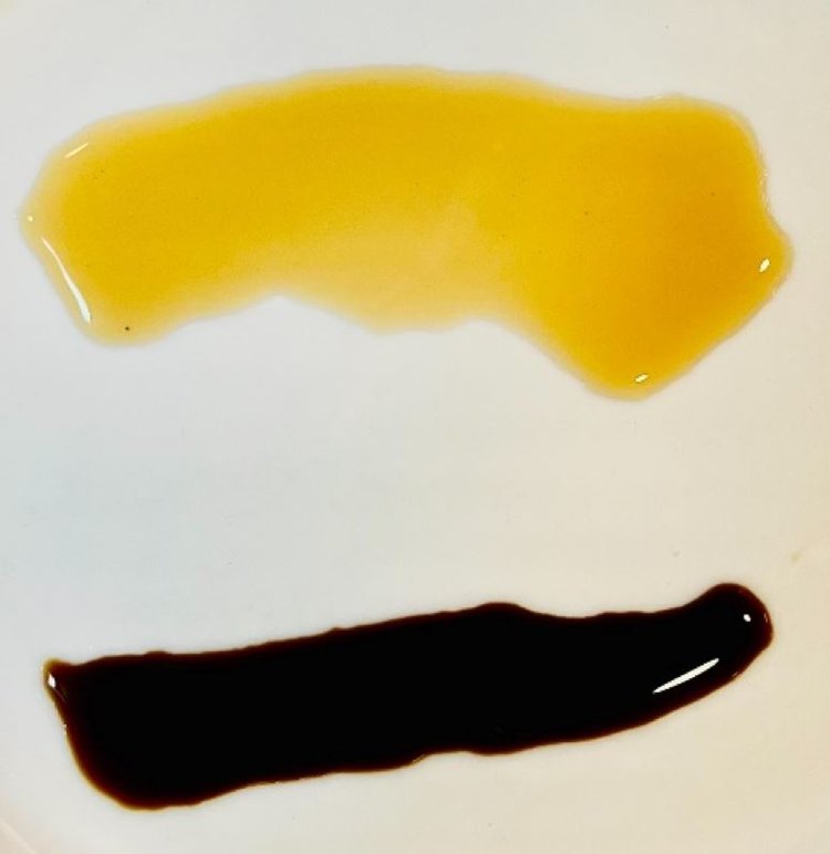 Черный уксус (вверху) и бальзамический уксус (внизу). Примечание: из-за своей жидкой консистенции и высокой прозрачности черный уксус кажется светлее, если его подавать в небольших количествах. Напротив, бальзамический уксус гуще и менее прозрачен, что приводит к более темному внешнему виду.
