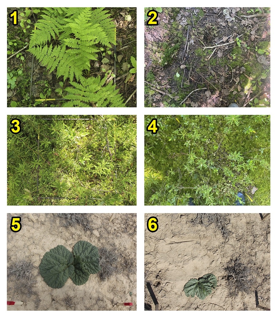 Рисунок 1. Реакция растений на внесение керосина в нагрузке 25 г/кг: 1,3,5 — площадки до внесения керосина (в смешанном лесу, на верховом болоте и в средней пустыне соответственно); 2,4,6 — те же площадки спустя год после внесения керосина.