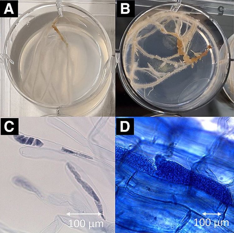A. Здоровые волосатые корни картофеля через 21 день после индукции Rhizobium rhizogenes. B. Образование галловидных структур на волосатых корнях. C. Спорангии Sss, окрашенные трипановым синим, обнаружены в корневых волосках через 4 недели после инокуляции. D. Спорангии Sss, окрашенные трипановым синим, обнаружены в коре волосатых корней через 8 недель после инокуляции. Автор: Самодья К. Джаясингхе и др.