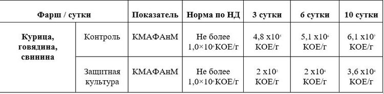 При добавлении защитной культуры на основе штамма педиококка в мясной фарш на третьи сутки зафиксировано достоверное снижение КАМАФАнМ по сравнению с контролем. На 10-е сутки уровень микрофлоры в образцах с защитной культурой был на 2,5*103 КОЕ/г ниже, чем в контрольных образцах, а также наблюдалось отсутствие развития и роста БГКП.